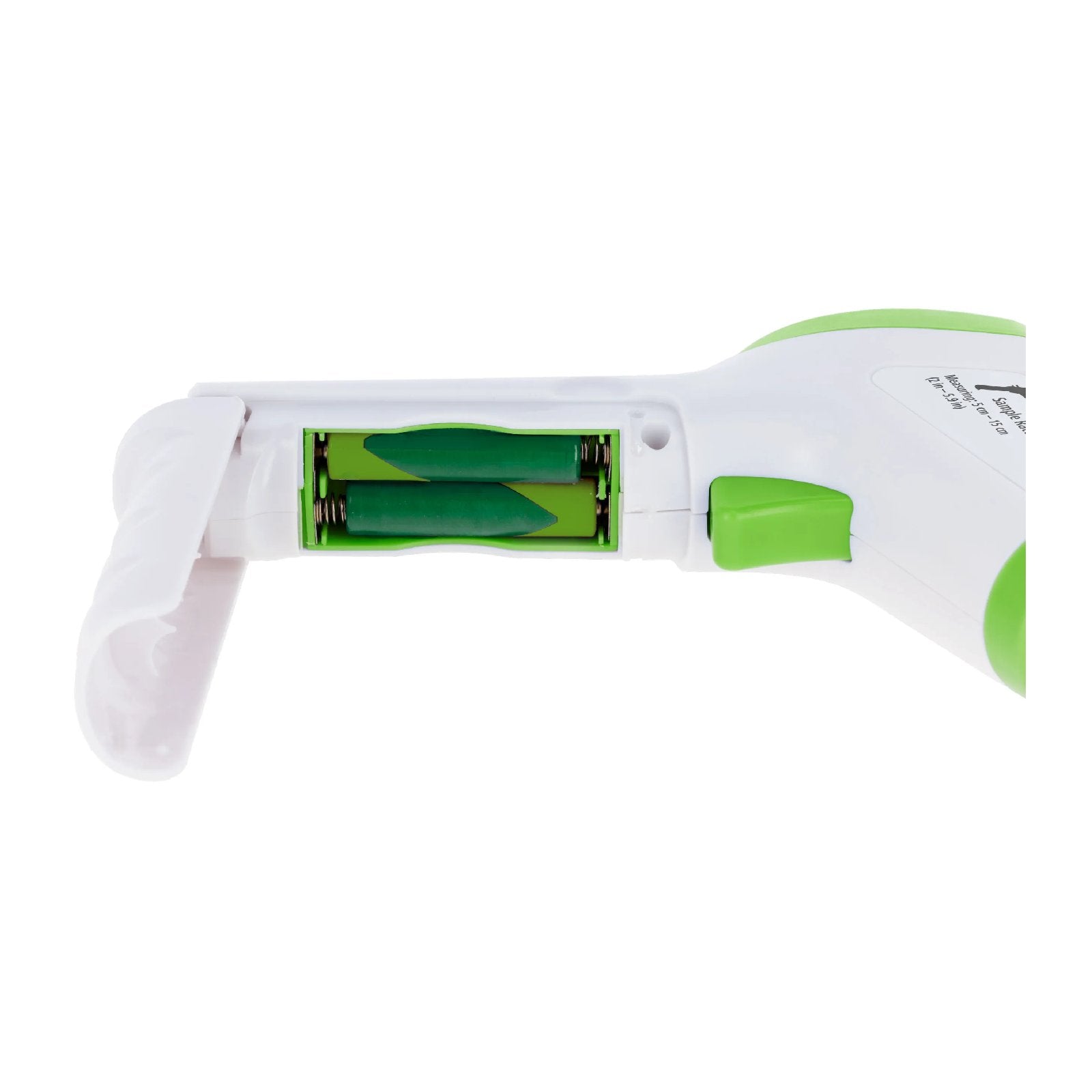 Termometern har en ergonomisk pistolform och är utrustad med laserpekare för exakt positionering. Mätningen görs genom att rikta lasern mot ett område med så lite hår som möjligt på 5–15 cm avstånd och trycka på knappen.