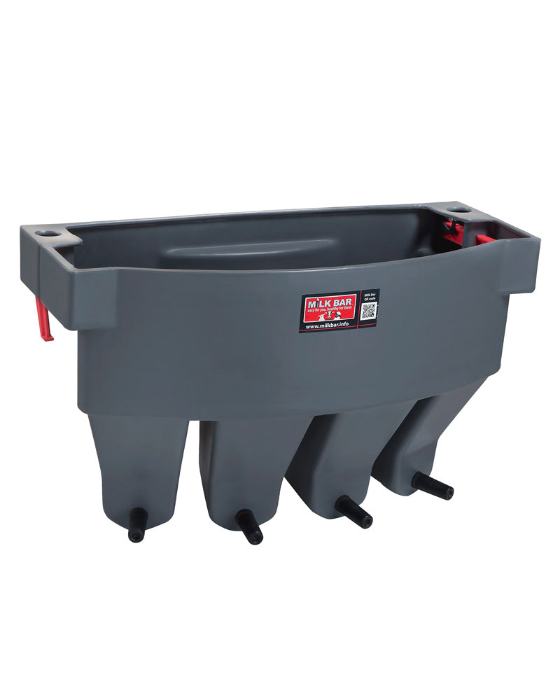 En handy lille foderautomat, rigtig god til mindre træningsbokse eller til gårde, der kun har få kalve hver uge. Med en pæn patteafstand kan den bruges helt op til fravænning. Foderautomaterne kan stables, så flere kan medbringes ad gangen. Udstyret med Ezi-låsekroge, der fastgør føderen til enhver skinne eller port op til 75 mm bred. Rummet rummer 2,5L og den samlede volumen er 24L. Udstyret med Milk Bar™-sutter for at reducere udbrud.
