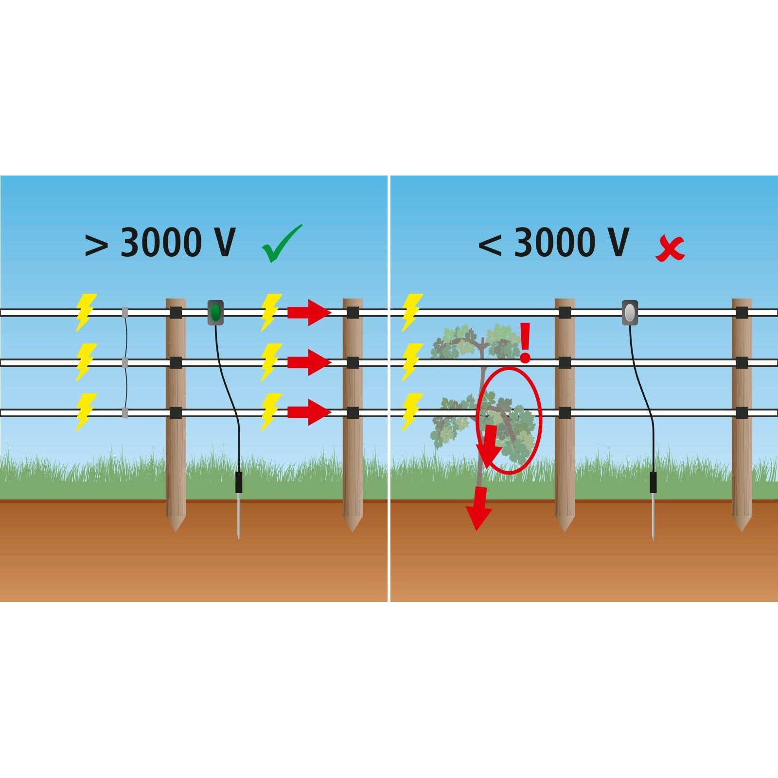 Asiantuntijan vinkki: Aseta pulssisalama aitausjärjestelmän päähän. Tämä tarkoittaa, että näet yhdellä silmäyksellä, virtaako 2500 V:n vähimmäisjännite aidan päässä ja siten koko järjestelmäsi läpi.