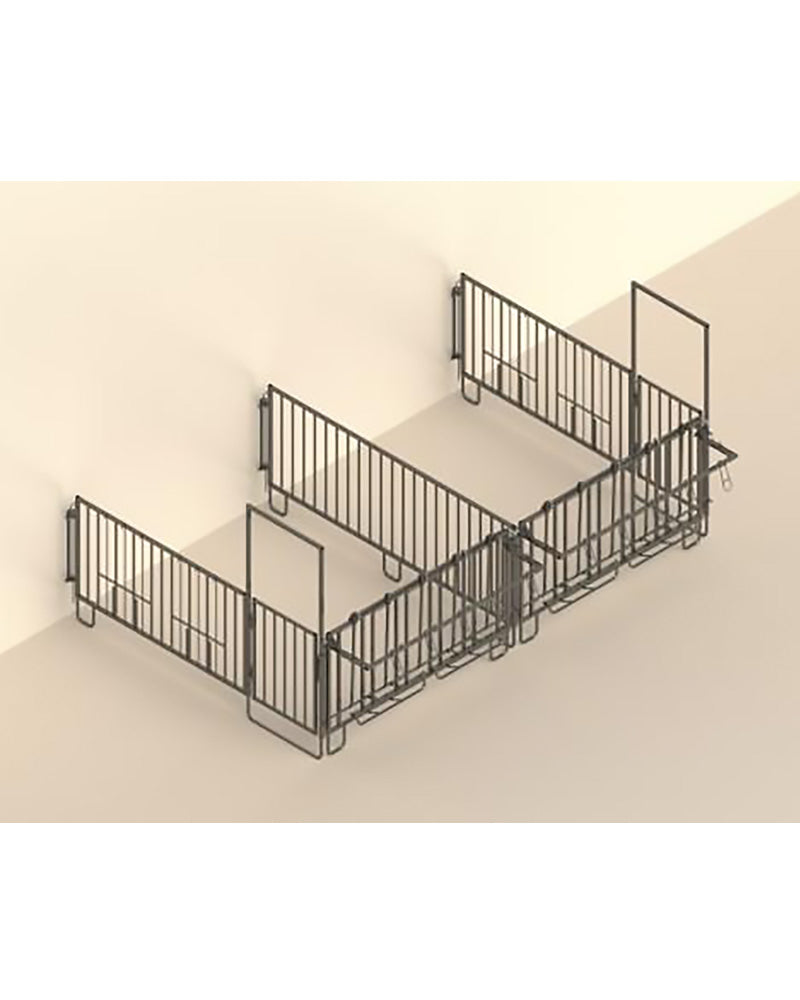6 vasikan setti Sisältää: 3 x seinäkiinnike, 2 x pitkä aitaosa portilla, 1 x pitkä aitaosa, 2 x 5-osainen turvaristikko.