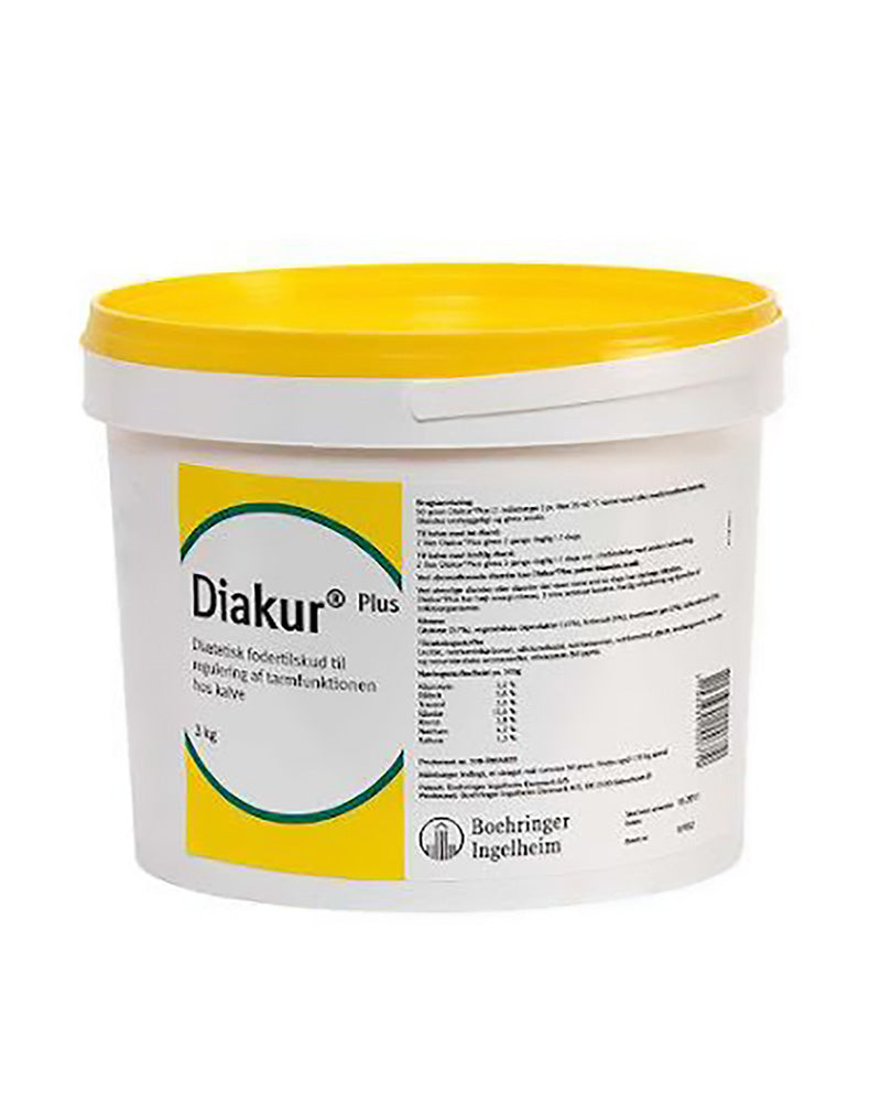 Till större kalvar: 150 g Diakur® Plus (3 dosmått) löses i 3 liter 35-40°C varmt vatten och ges 3 gånger dagligen i 1-7 dagar.
