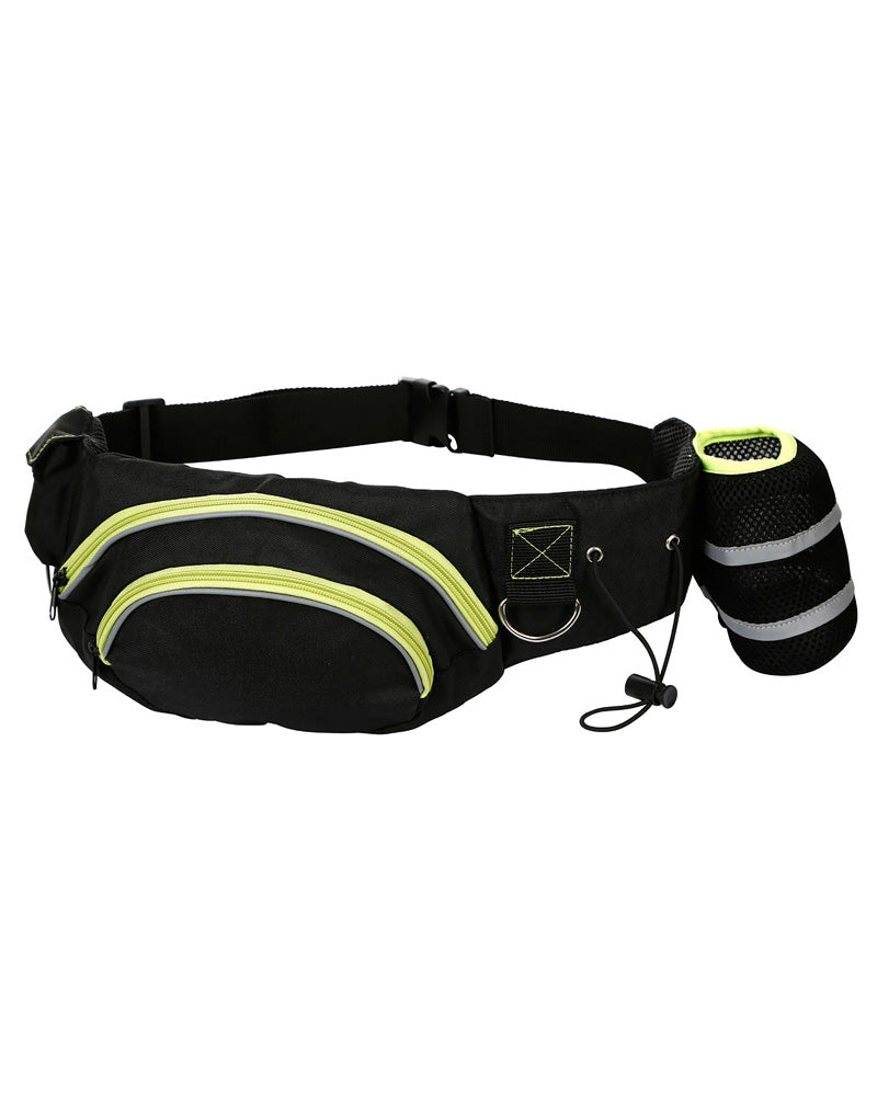 Utrustad med två blixtlåsfickor, hundbajsficka, D-ring, resårögla och dryckesflaskficka.