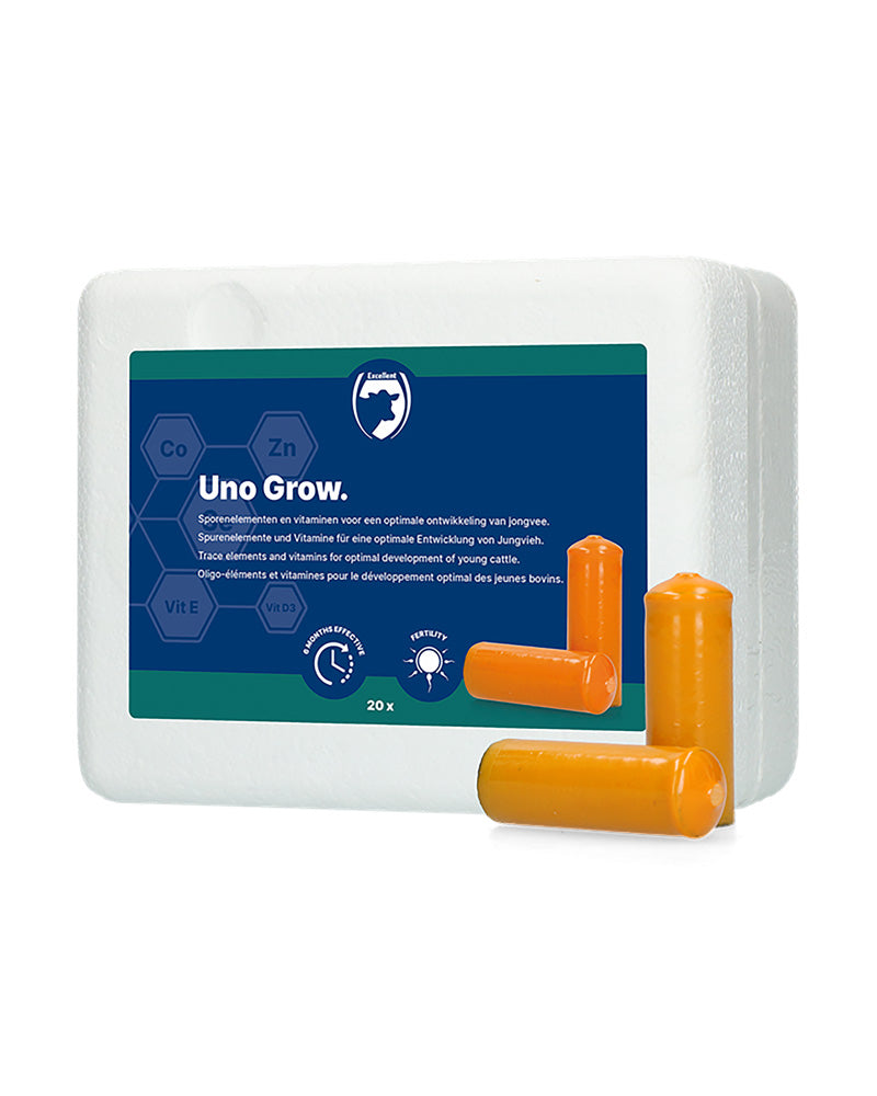 Den rekommenderade foderinstruktionen är 2 UNO Grow-bolus per ungnöt med en vikt på 150 kg eller mer. Bolusen börjar lösas upp långsamt på den platta sidan och beläggningen runt bolusen ser till att bolusen gradvis löses upp under en period av 180 dagar (6 månader). Administrering av 2 bolusdoser rekommenderas eftersom detta tillgodoser det aktuella behovet av spårämnen och vitaminer. Dessutom berör de två bolusarna varandra, vilket säkerställer en konstant frisättning