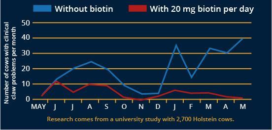 Forskning visar att nötkreatur som utfodras med 20 mg biotin per dag får friskare klövar.